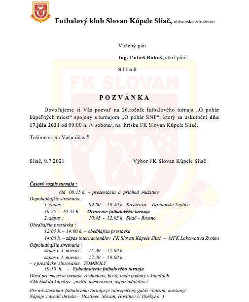 Dovoľujeme si Vás pozvať na 26.ročník futbalového turnaja „O pohár kúpeľných miest“ spojený s turnajom „O pohár SNP“, ktorý sa uskutoční dňa 17.júla 2021 od 09:00 h. /v sobotu/, na ihrisku FK Slovan Kúpele Sliač.