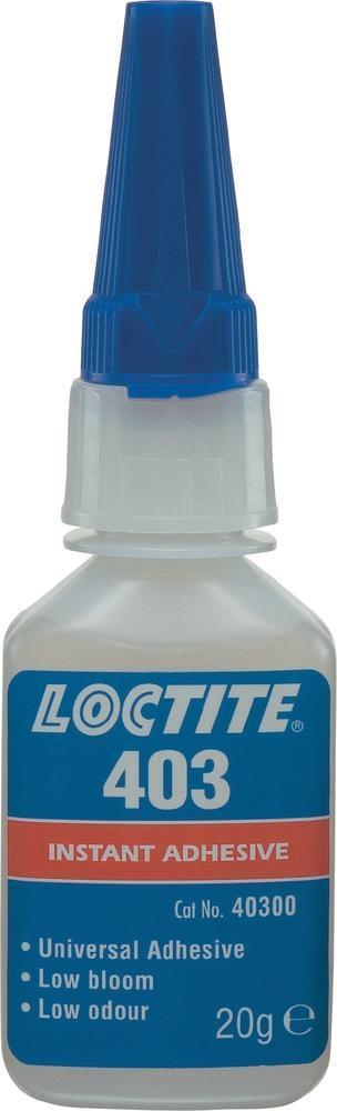Loctite 403 Sekundové lepidlo Loctite 403 - malý zákal, malý zápach, stredná viskozita Technické údaje Doba spevnenia: 5 - 20 sekúnd Farba: bezfarebné, priehľadné Viskozita v mPa.s: 1.200 Rozpätie prevádzkovej teploty: -40 °C až +80 °C Veľkosť balenia: 20g, 50g, 500g