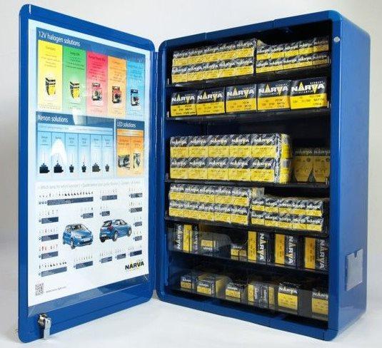 Celokovový uzamykateľný predajný box na zavesenie na stenu. Rozmery výška x šírka x hĺbka: 56cm x 37,5 x 18,5cm Rozteč otvorov pre zavesenie: 30cm Zamkýnanie kľúčom Magnetické dvierka 2 plastové šuplíky plus 7 nastaviteľných plastových políc vo vnútri boxu Hmotnosť: 10 kg Predajný pult so žiarovkami pre napätie 12Volt obsahuje : No 48320 H1 - 10ks No 48321 H3 - 10ks No 48881 H4 - 10ks No 48328 H7 - 30ks No 17171 R5W - 20ks No 17311 R10W - 20ks No 17635 P21W - 20ks No 17638 PY21W - 10ks No 17916 P21/5W - 10ks No 17881 P21/4W - 10ks No 17125 C5W - 20ks No 17131 T4W - 20ks No 17177 W5W - 30ks No 17037 W1,2W - 20ks